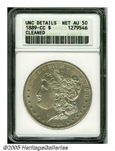 <B>1889-CC<S$1>--Cleaned--ANACS. Unc Details, Net AU50.</B></I> Always popular as the most elusive Carson City date in the Morgan series, the 1889-CC has an impressively low mintage of only 350,000 pieces. This is a well defined example that is fully struck. The surfaces, however, are dull from cleaning and each side has an overlay of light gray-golden toning. Relatively mark-free with no notable abrasions on either side.