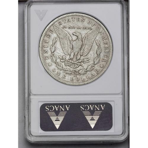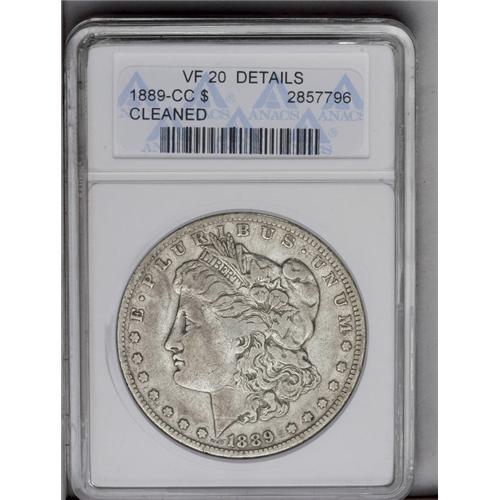 <B>1889-CC<img border='0' src='http://www.heritagecoins.com/images/star.gif' width=10 height=10>$1>--Cleaned--ANACS. VF20 Details.</B></I> A circulated slate-gray key date Carson City dollar. A bit bright from cleaning, but still a prize to the majority of date and mint collectors.