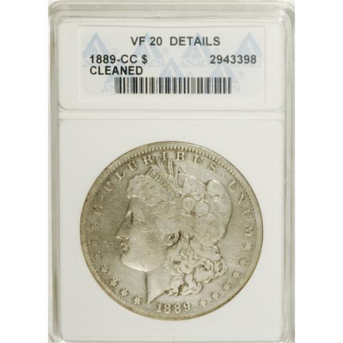 <B>1889-CC S$1 --Cleaned--ANACS. VF20 Details.</B></I> A moderately worn pearl-gray representative of this key Carson City issue. Multiple abrasions affect the portrait and the surrounding fields.<BR><BR><b>Shipping:</b> Coins & Currency (<a target="_blank" href="http://www.heritageauctions.com/common/shipping.php">view shipping information</a>)