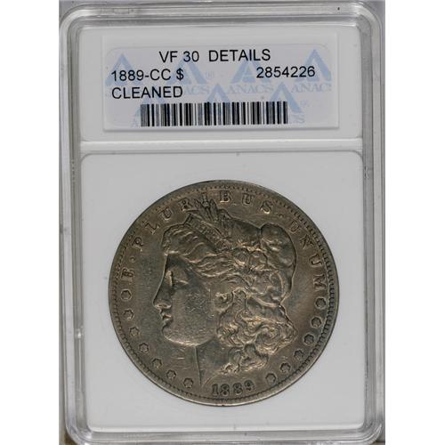 1889-CC S$1 --Cleaned--ANACS. VF30 Details. Although po 1889-CC