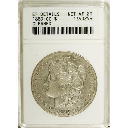 <B>1889-CC S$1 --Cleaned--ANACS. XF Details. Net VF20.</B></I> Bright overall from cleaning and lightly hairlined. The wear is moderate, and there are no large or mentionable marks. The key to the Carson City Morgan series.<BR><BR><b>Shipping:</b> Coin/Currency (<a target="_blank" href="http://www.heritageauctions.com/common/shipping.php">view shipping information</a>)