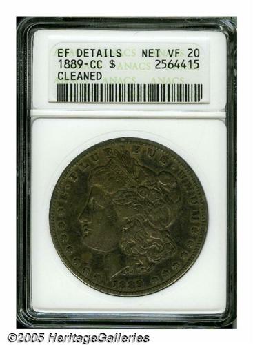 <B>1889-CC<S$1>--Cleaned--ANACS. XF Details, Net VF20.</B></I> Perhaps a bit bright despite the deep olive-brown patination, this key date Carson City Dollar has a small rim nick at 12 o'clock on the obverse, in addition to a few other distributed and moderate marks.
