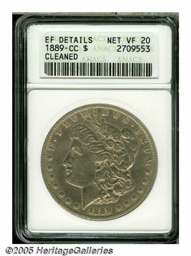 <B>1889-CC<S$1>--Cleaned--ANACS. XF Details, Net VF20.</B></I> A polished and circulated slate-gray example of the rarest Carson City Morgan Dollar issue. The cheek has several small marks.