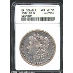 1889-CC S$1--Cleaned--ANACS. XF Details, Net VF30. A glossy lilac-gray example that has no mentionable abrasions. The details are sharp for the net grade. The borders offer traces of mint luster. A low mintage Carson City date that unlike earlier issues did not significantly appear in the GSA hoards.From the Hans Poetsch Collection. Important notice: We expect to be auctioning lots at the rate of 200-250 per hour. Sometimes eBay Premier live bid software cannot keep up with that pace, so we strongly recommend that you place a realistic proxy bid now as insurance to avoid disappointment. Also please note that all Heritage/CAA lots purchased through eBay Premier carry a 20% Buyer's Premium. Please make sure you read the Terms and Conditions.