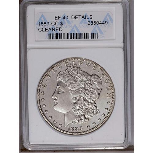 <B>1889-CC<img border='0' src='http://www.heritagecoins.com/images/star.gif' width=10 height=10>$1>--Cleaned--ANACS. XF40 Details.</B></I> A glossy and hairlined piece with light ice-blue and gold hues. A sharp example of the most desired Carson City Morgan dollar date.