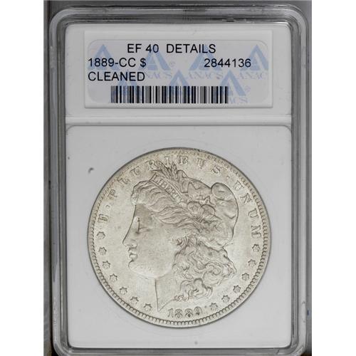<B>1889-CC<img border='0' src='http://www.heritagecoins.com/images/star.gif' width=10 height=10>$1>--Cleaned--ANACS. XF40 Details.</B></I> Delicate champagne-gray color adheres to lightly cleaned surfaces that reveal some fine hairlines, along with minute abrasions scattered about. Nice detail is retained on the motifs, except for the hair over Liberty's ear and on the eagle's breast. A decent example of this scarce Carson City issue, despite the ANACS disclaimer. <BR><BR><B>Important notice:</B> Heritage usually auctions material at the rate of 200-250 lots per hour. On some occasions eBay Live bid software or the Internet may not be able to keep up with the pace of the auction. We recommend placing a realistic absentee bid now as insurance to avoid disappointment. Occasionally the auctioneer may eliminate or reject an eBay Live bid, and the auctioneer may also reopen a lot after the close of the eBay live bidding (usually because we missed an audience bid), and may reject your bid even if it shows you as the winning bidder. By bidding via eBay Live, you agree that Heritage may award the lot to another bidder at its sole discretion under the circumstances described above or any other reasonable circumstances. Since eBay bids are not shown to us until we open the lot on the floor, we treat those bids just like floor bids. In most cases the floor responds before the eBay bid is presented to us, due to Internet lag time, so for consistency we have made it a policy that floor bids are always considered first over tie eBay live bids. Also please note that all Heritage lots purchased through eBay Live carry a 20% Buyer's Premium. Please make sure you read the Terms and Conditions before you bid. This lot is being auctioned in conjunction with a live floor auction by Heritage Galleries & Auctioneers. All final auction and invoice information will be supplied by Heritage Galleries & Auctioneers, and all other information should be considered preliminary. Lot:3512 <BR><BR><B>Winning Notification and Billing:</B> After the FINAL session in this auction is complete, Heritage will send e-mail and snail mail invoices. This process normally takes several days. All final auction and invoice information will be supplied by Heritage Galleries & Auctioneers, and all other information should be considered preliminary. <BR><BR>This auction will be conducted on a live auction floor and over the Internet through eBay Live. If you choose to place an absentee bid, please take a moment to <font color='#0000ff'><u><a href='http://pages.ebay.com/liveauctions/help/before/laabsentee.html'>learn how eBay Live absentee bidding works</a></u></font><font color='#000000'>