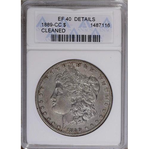 <B>1889-CC<img border='0' src='http://www.heritagecoins.com/images/star.gif' width=10 height=10>$1>--Cleaned--ANACS. XF40 Details.</B></I> Faint gray color with hints of gold toning over lightly hairlined fields. Still a pleasing and desirable example of this rarity.