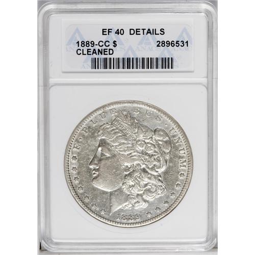 <B>1889-CC<img border='0' src='http://www.heritagecoins.com/images/star.gif' width=10 height=10>$1>--Cleaned--ANACS. XF40 Details.</B></I> Intermittent milky patina remains on the surfaces after heavy cleaning. Significant wear is noted at the highpoints, and scattered handling marks are noted in the fields.