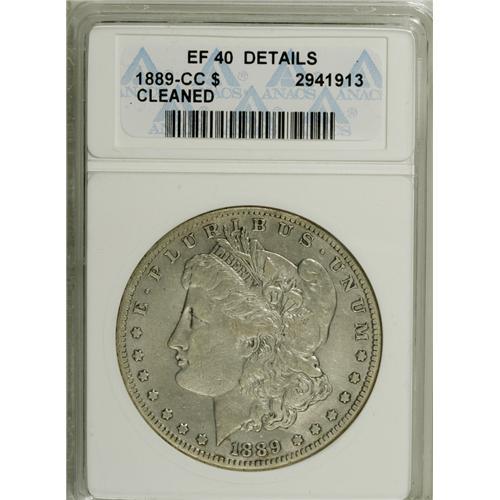 <B>1889-CC S$1 --Cleaned--ANACS. XF40 Details.</B></I> The fields are thickly hairlined, and the centers show moderate wear, but the devices of this key date Carson City dollar retain considerable definition.<BR><I>From The Dale A. Konigsburg Collection, Part Two.</B></I><BR><BR><b>Shipping:</b> Coins & Currency (<a target="_blank" href="http://www.heritageauctions.com/common/shipping.php">view shipping information</a>)
