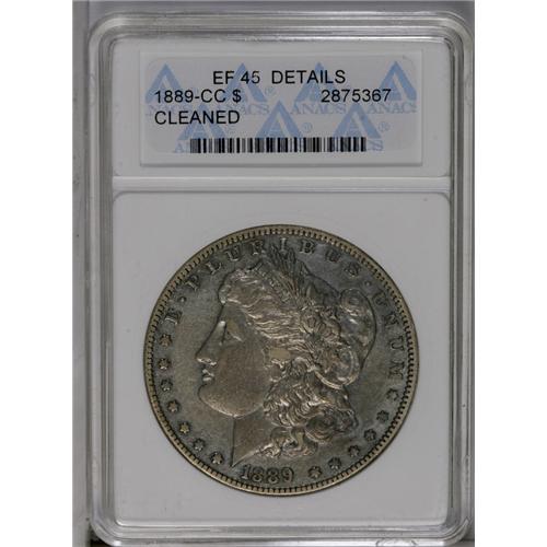 <B>1889-CC<img border='0' src='http://www.heritagecoins.com/images/star.gif' width=10 height=10>$1>--Cleaned--ANACS. XF45 Details.</B></I> Lightly cleaned and spot-worn with some retoning in brick-red and blue. An affordable, nicely detailed example of this difficult date.