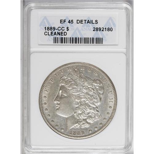 <B>1889-CC<img border='0' src='http://www.heritagecoins.com/images/star.gif' width=10 height=10>$1>--Cleaned--ANACS. XF45 Details.</B></I> The lightly toned surfaces display substantial details and are actually more attractive than many so-called AU examples of this popular Carson City key date. Downgraded by ANACS due to improper cleaning long ago, from which the surfaces have recovered nicely. Few marks are seen, and all of them are minor.