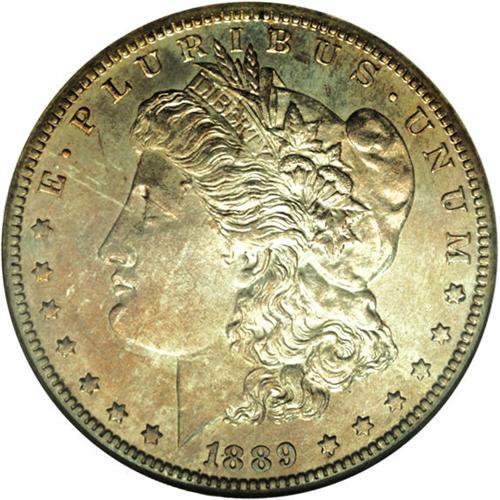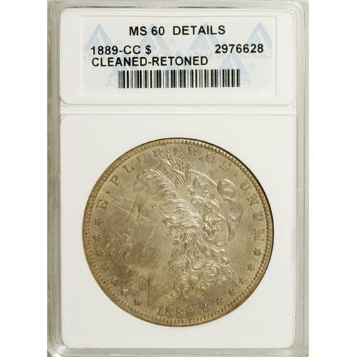 <B>1889-CC S$1 --Cleaned, Retoned--ANACS. MS60 Details.</B></I> There is no doubt that this is the rarest Carson City date in the entire series, even though two others (1881-CC and 1885-CC) have lower mintages. Just 350,000 of these coins were minted after an intermission from 1886 to 1888 where the Carson City Mint was dormant. Apparently the entire mintage was needed in local commerce as few have survived in Mint State quality. This piece has light hairlines on both sides, with gold toning recently applied to the surfaces. The fields on both sides are reflective, and overall this example remains highly desirable.<BR><BR><b>Shipping:</b> Coins & Currency (<a target="_blank" href="http://www.heritageauctions.com/common/shipping.php">view shipping information</a>)