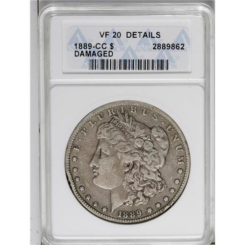 <B>1889-CC S$1 --Damaged--ANACS. VF20 Details.</B></I> A set of pinscratches is present left of Liberty's ear, and the obverse rim is bruised at 5 and 8 o'clock. Fine pinscratches are also present beneath the eagle's beak. Still a suitably detailed example of this coveted Carson City key date.<BR><BR><b>Shipping:</b> Coin/Currency (<a target="_blank" href="http://www.heritageauctions.com/common/shipping.php">view shipping information</a>)