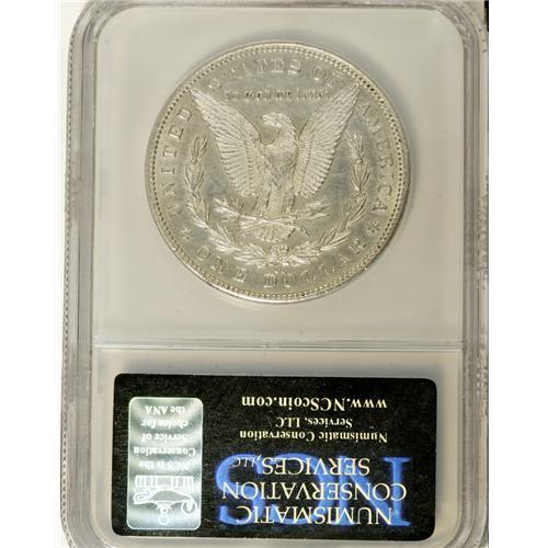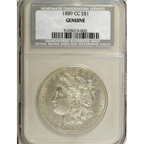<B>1889-CC S$1 --Genuine--NCS.</B></I> We believe that this key date Carson City dollar has AU sharpness, but the pearl-gray surfaces are subdued by overdipping, and a series of tiny marks are also present beneath TRUST. Still a bold example with substantial luster and no obvious abrasions.<BR><BR><b>Shipping:</b> Coins & Currency (<a target="_blank" href="http://www.heritageauctions.com/common/shipping.php">view shipping information</a>)