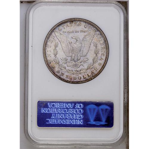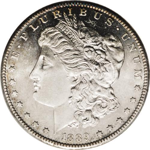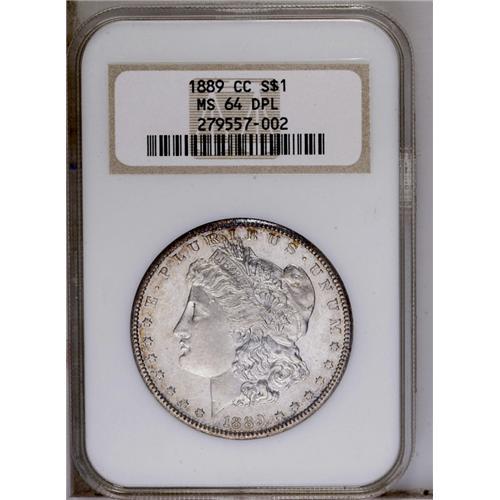 <B>1889-CC<img border='0' src='http://www.heritagecoins.com/images/star.gif' width=10 height=10>$1> MS64 Deep Mirror Prooflike NGC.</B></I> No other Carson City dollar in this popular series garners the respect of the '89-CC. The dispersal of vast quantities of CC Morgans from Treasury and Redfield hoards saw every date, including the 1879-CC, increase in uncirculated numbers from roughly 5,000 coins to over 900,000 pieces. Every date, that is, except for the 1889-CC with only a single reported bag from government vaults being the chief source of Mint State pieces today. A generous percentage of high grade '89-CC survivors exhibit either prooflike or deep mirror prooflike fields, but the vast majority of those are heavily abraded and grade MS62 at best. Despite a limited mintage of 350,000 pieces, this issue was also largely consumed in the channels of commerce.<BR> All but unsurpassable in terms of both technical and aesthetic appeal, this lovely near-Gem sparkles with glassy fields and boldly impressed devices. The overall appearance is one of radiant brilliance, but delicate golden-russet rim accents are noted on both sides. With no individually mentionable bagmarks, this coin belongs in the collection of an advanced Morgan dollar specialist. Census: 13 in 64 DMPL, none are finer at either service (3/06). <BR><BR><B>Important notice:</B> Heritage usually auctions material at the rate of 200-250 lots per hour. On some occasions eBay Live bid software or the Internet may not be able to keep up with the pace of the auction. We recommend placing a realistic absentee bid now as insurance to avoid disappointment. Occasionally the auctioneer may eliminate or reject an eBay Live bid, and the auctioneer may also reopen a lot after the close of the eBay live bidding (usually because we missed an audience bid), and may reject your bid even if it shows you as the winning bidder. By bidding via eBay Live, you agree that Heritage may award the lot to another bidder at its sole discretion under the circumstances described above or any other reasonable circumstances. Since eBay bids are not shown to us until we open the lot on the floor, we treat those bids just like floor bids. In most cases the floor responds before the eBay bid is presented to us, due to Internet lag time, so for consistency we have made it a policy that floor bids are always considered first over tie eBay live bids. Also please note that all Heritage lots purchased through eBay Live carry a 20% Buyer's Premium. Please make sure you read the Terms and Conditions before you bid. This lot is being auctioned in conjunction with a live floor auction by Heritage Galleries & Auctioneers. All final auction and invoice information will be supplied by Heritage Galleries & Auctioneers, and all other information should be considered preliminary. Lot:3521 <BR><BR><B>Winning Notification and Billing:</B> After the FINAL session in this auction is complete, Heritage will send e-mail and snail mail invoices. This process normally takes several days. All final auction and invoice information will be supplied by Heritage Galleries & Auctioneers, and all other information should be considered preliminary. <BR><BR>This auction will be conducted on a live auction floor and over the Internet through eBay Live. If you choose to place an absentee bid, please take a moment to <font color='#0000ff'><u><a href='http://pages.ebay.com/liveauctions/help/before/laabsentee.html'>learn how eBay Live absentee bidding works</a></u></font><font color='#000000'>