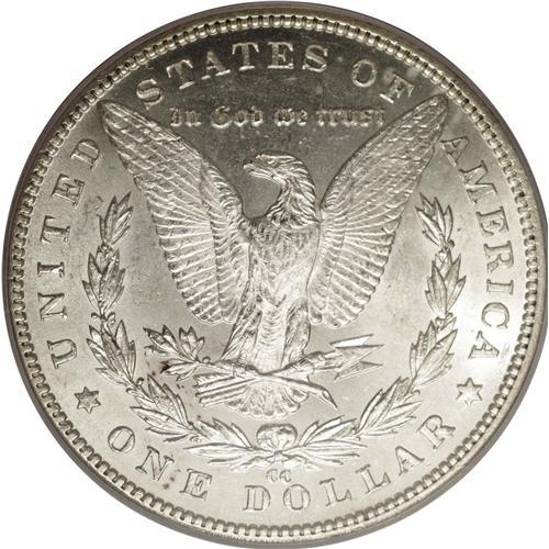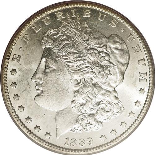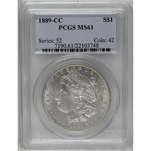 <B>1889-CC<img border='0' src='http://www.heritagecoins.com/images/star.gif' width=10 height=10>$1> MS61 PCGS.</B></I> The 1889-CC is widely known as the rarest of all Carson City dollars. Only 350,000 pieces were produced and there is a pronounced lack of survivors in AU and better grades. This piece is very sharply struck throughout and each side shows a brilliant silver-white appearance. A few small abrasions are seen, most notably one on Liberty's cheek, but the coin seems to derive its grade from a general lackluster appearance more than from abrasions. The number of collectors pursuing this series is undoubtedly higher than the surviving population of Mint State examples of this date.