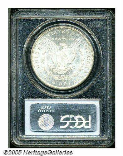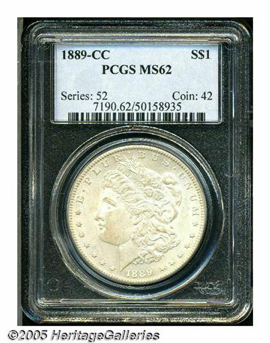 <B>1889-CC<S$1> MS62 PCGS.</B></I> The 1889-CC is the key to the Carson City series of Morgan dollars. Its mintage of only 350,000 pieces is impressively low for the series, and while available in circulated grades with some regularity, the '89-CC is a scarce and valuable issue in mint condition. Sharply struck throughout, the mint luster on this piece is excellent with the usual, thick mint frost common to all Carson City dollars. At first glance, this coin appears even finer than the stated grade, but closer examination reveals a cosmetically tragic diagonal staple scratch on Liberty's cheek behind the nose. Mostly brilliant, there is a slight accent of reddish patina on the obverse. Population: 74 in 62, 105 finer (3/05).