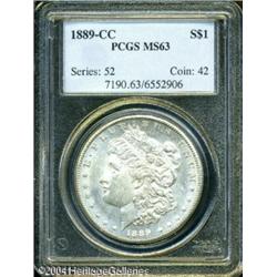 1889-CC S$1 MS63 PCGS. The '89-CC is widely recogn <B>1889-CC S$1 MS63 PCGS.</B></I> The '89-CC is widely recognized as one of the top five rarities in the Morgan Dollar series in Mint State condition, and is the undisputed key among Uncirculated Carson City issues. The surfaces on this wonderfully preserved example display razor sharp detail in the centers and, while not fully prooflike as are a decent percentage of high grade survivors, show gleaming cartwheel luster in the fields. Only a whisper of scuffiness on Liberty's cheek and a few paper thin reeding marks to the left of the portrait separate this '89-CC from even loftier levels. <BR><BR><B>Important notice:</B> Heritage usually auctions material at the rate of 200-250 lots per hour. On some occasions eBay Live bid software or the Internet may not be able to keep up with the pace of the auction. We recommend placing a realistic absentee bid now as insurance to avoid disappointment. Occasionally the auctioneer may eliminate or reject an eBay Live bid, and the auctioneer may also reopen a lot after the close of the eBay live bidding (usually because we missed an audience bid), and may reject your bid even if it shows you as the winning bidder. By bidding via eBay Live, you agree that Heritage may award the lot to another bidder at its sole discretion under the circumstances described above or any other reasonable circumstances. Since eBay bids are not shown to us until we open the lot on the floor, we treat those bids just like floor bids. In most cases the floor responds before the eBay bid is presented to us, due to Internet lag time, so for consistency we have made it a policy that floor bids are always considered first over tie eBay live bids. Also please note that all Heritage lots purchased through eBay Live carry a 20% Buyer's Premium. Please make sure you read the Terms and Conditions before you bid. This lot is being auctioned in conjunction with a live floor auction by Heritage Galleries & Auctioneers. All final auction and invoice information will be supplied by Heritage Galleries & Auctioneers, and all other information should be considered preliminary. Lot:7571
