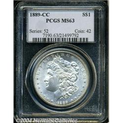 <B>1889-CC<S$1> MS63 PCGS.</B></I> This select quality '89-CC dollar is remarkable for its excellent eye appeal. The surfaces are fully brilliant with a hint of pale gold toning only at the borders on each side, and this color is barely perceptible. in <I>The Official Red Book of Morgan Silver Dollars,</B></I> author Dave Bowers provided an "Optimal Collecting Grade" for every issue, and for this 1889-CC dollar, MS63 is the optimal grade. This opinion no doubt factors in the potential for an attractive coin at an affordable price in relation to other grades for the same date. This specimen is very sharply struck with much more detail than the typical example. The present offering provides the advanced collector with an extremely important opportunity. <BR><BR><B>Important notice:</B> Heritage usually auctions material at the rate of 200-250 lots per hour. On some occasions eBay Live bid software or the Internet may not be able to keep up with the pace of the auction. We recommend placing a realistic absentee bid now as insurance to avoid disappointment. Occasionally the auctioneer may eliminate or reject an eBay Live bid, and the auctioneer may also reopen a lot after the close of the eBay live bidding (usually because we missed an audience bid), and may reject your bid even if it shows you as the winning bidder. By bidding via eBay Live, you agree that Heritage may award the lot to another bidder at its sole discretion under the circumstances described above or any other reasonable circumstances. Since eBay bids are not shown to us until we open the lot on the floor, we treat those bids just like floor bids. In most cases the floor responds before the eBay bid is presented to us, due to Internet lag time, so for consistency we have made it a policy that floor bids are always considered first over tie eBay live bids. Also please note that all Heritage lots purchased through eBay Live carry a 20% Buyer's Premium. Please make sure you read the Terms and Conditions before you bid. </span></font></tr></table></td></tr></table>