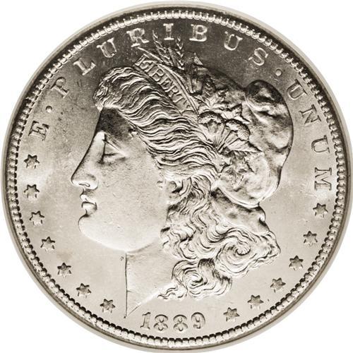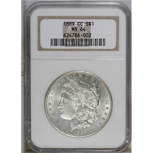<B>1889-CC<img border='0' src='http://www.heritagecoins.com/images/star.gif' width=10 height=10>$1> MS64 NGC.</B></I> One of the Great Triumvirate of Carson City Morgan dollar keys along with the 1879-CC and the 1893-CC, the 1889-CC is nonetheless the rarest and most desirable of the trio, by far. Most of the original mintage of 350,000 pieces entered circulation and, according to Bowers, small groups and singles were paid out from the Treasury in the 1930s and beyond. Bowers' silver dollar <I>Red Book</B></I> adds this tantalizing note concerning the issue:<BR><BR><I>From pre-1964 holdings stored out West, several bags of Mint State coins were held in Nevada and were described to me years ago. I had a chance to buy a bag, from Ben Stack, but did not. Where they are now, I do not know. However, as Mint State pieces are few and far between on the market today, some of these groups must still be tightly held, if, indeed, reports of them are true. After a while one tends to be a skeptic. On the other hand, in numismatics there are no end of surprises, and every few years an "impossible" hoard or large group or something or other comes on the market to surprise and delight all of us.<BR><BR></B></I> It appears from the certified population that no Mint State bags were <I>ever</B></I> released, as the total of Mint State survivors at NGC and PCGS combined is less than 900 pieces, counting resubmissions. It also appears certain from the high prices that collectors pay to own Choice examples such as the present coin--which would certainly draw out any existing hoards--that the likelihood of a Mint State bag appearing in the future is, shall we say, minuscule.<BR> The present coin is brilliant and untoned, with superlative, radiant cartwheel luster but little field-device contrast. The strike is bold, and only a few tiny abrasions are seen, completely consistent with the grade. A tiny die crack runs through the 889 and to star 13, invisible without a loupe. The exuberant luster is this coin's strongest suit--not that it has any particular weaknesses. This is, in a word, an enormously <I>appealing</B></I> and highly collectible coin, one destined for a truly fine set of Morgan dollars. Census: 38 in 64, 5 finer (9/06).