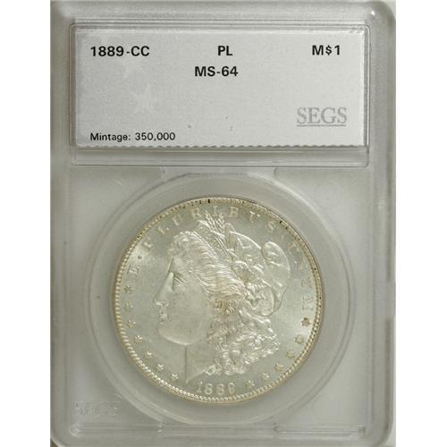 <B>1889-CC S$1 MS64 Prooflike SEGS (MS60 Cleaned).</B></I> In addition to its key status in the Morgan dollar series, the 1889-CC is a popular and desirable coin with prooflike fields. Such coins are not especially rare in the context of 1889-CC dollars with approximately half of the high grade examples showing some degree of reflectivity. Nevertheless, prooflike coins are always eagerly sought out by advanced collectors. This piece shows confirmed reflectivity in the fields on each side. The striking details are also fully defined on both obverse and reverse with crisp definition over the ear of Liberty and on the breast of the eagle. The surfaces are notably free from abrasions, but the obverse is lackluster from the effects of cleaning. Brilliant except for an almost imperceptible dab of russet color in the center of the obverse.<BR><BR><b>Shipping:</b> Coins & Currency (<a target="_blank" href="http://www.heritageauctions.com/common/shipping.php">view shipping information</a>)