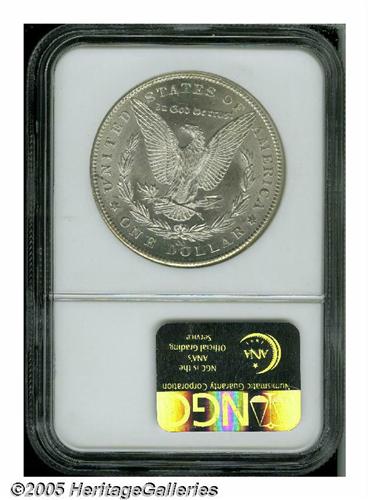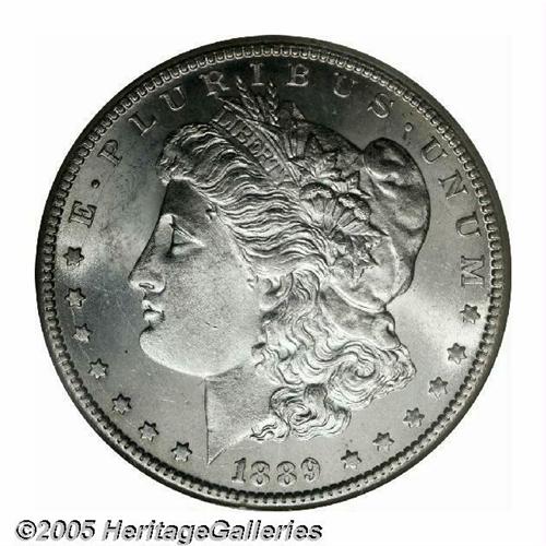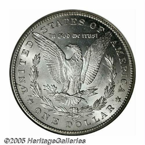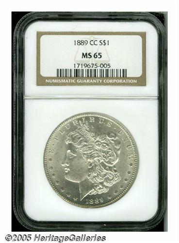 <B>1889-CC<S$1> MS65 NGC.</B></I> To the devoted Morgan Dollar enthusiast, the 1889-CC is a desirable issue in any grade and a rarity of legendary proportions at the Uncirculated level, being out of reach to most collectors even in average Mint State grades. The remarkable Gem we now offer shares little with the typical high grade survivor. Not only are the untoned surfaces totally lacking in prooflike or even semi-prooflike qualities, but the fields are actually satiny in appearance. Further inspection reveals central devices that are profoundly clean and struck with the near-perfect execution that is characteristic of the issue. Only the most trivial blemishes can be found in the fields, and there are die cracks on each side that connect some of the peripheral devices. Some notable die clashing is also noted on the reverse, only being mentioned due to the importance of the offering. This sale and any of our signature auctions are certain to include a number of "important" Morgan Dollars, but few such pieces exceed or even approach the cachet of a Gem 1889-CC. Population: 4 in 65, 1 finer (4/05).