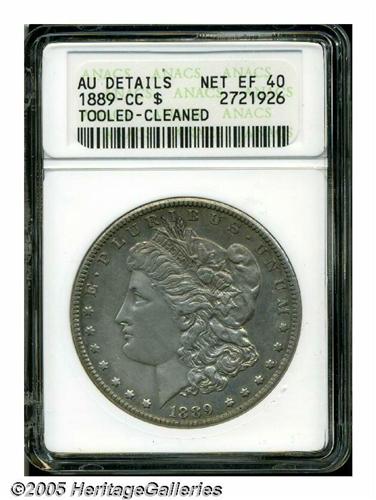 <B>1889-CC<S$1>--Tooled, Cleaned--ANACS. AU Details, Net XF40.</B></I> Nice details remain, for the grade, and the appearance of the coin has only been partially effected by tooling on Liberty's face and a harsh cleaning. An affordable example of this key date.