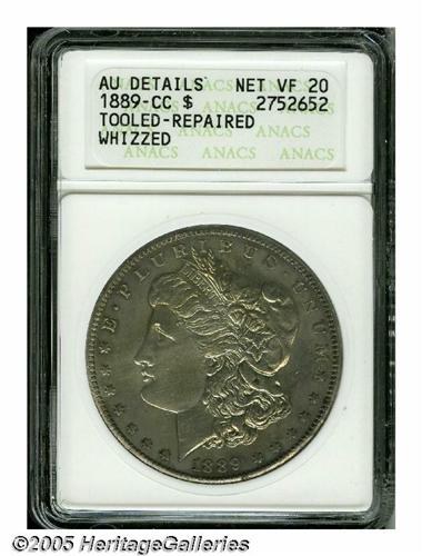 <B>1889-CC<S$1>--Tooled, Repaired--ANACS. AU Details, Net VF20.</B></I> Glossy olive golden surfaces. Evenly whizzed, tooling has re-engraved some of the detail in the hair.