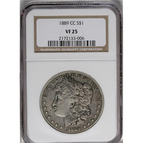 1889-CC S$1 VF25 NGC. The medium-gray surfaces have hi