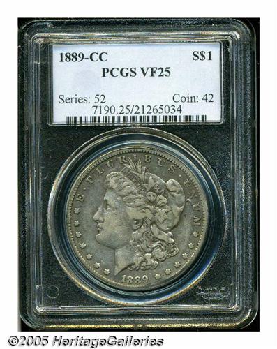 <B>1889-CC<S$1> VF25 PCGS.</B></I> A circulated survivor of this key Carson City issue. Slate-gray, golden-brown, and charcoal colors are present. The wings retain ample details. A small dig near the N in UNUM is the sole distraction.