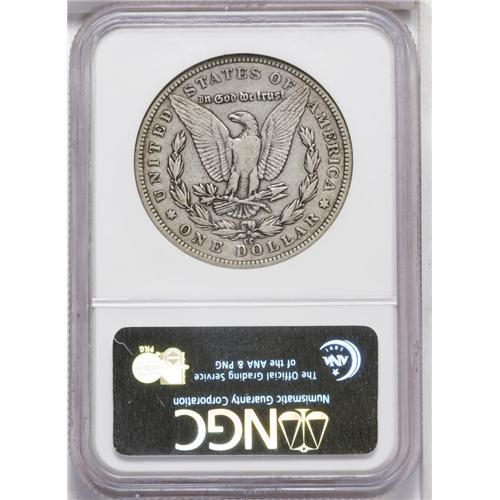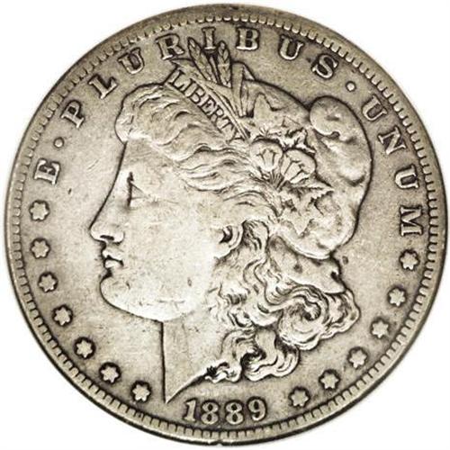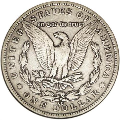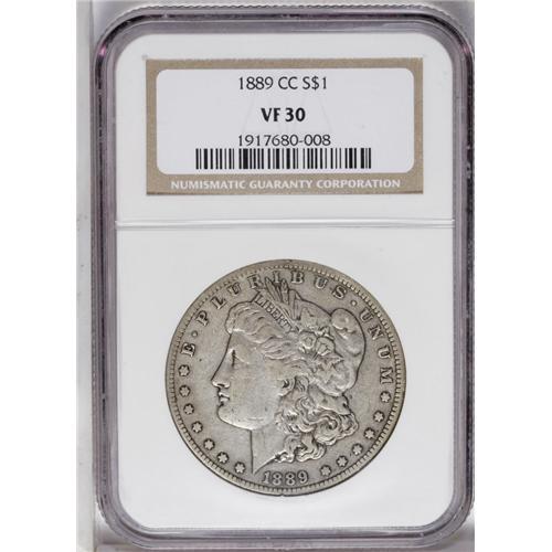 <B>1889-CC<img border='0' src='http://www.heritagecoins.com/images/star.gif' width=10 height=10>$1> VF30 NGC.</B></I> Like most dollars of this key date, this one has spent its share of time traveling the channels of commerce, as evidenced by the moderate degree of wear found on its surfaces, yet it remains attractive with its dove-gray color and minimal abrasions. An affordable, problem free alternative for the collector unable to afford the five figure price that a Mint State specimen would require.