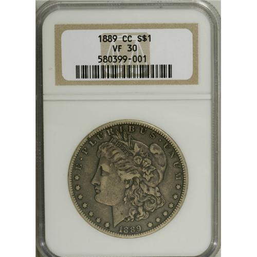 <B>1889-CC S$1 VF30 NGC.</B></I> This is a lovely mid-grade example of one of the most important key dates in the Morgan dollar series. Rose-gray toning covers both sides, and is somewhat deeper on the obverse. The devices are evenly worn, and a few small abrasions are noted on Liberty's face and in the left obverse field.<BR><BR><b>Shipping:</b> Coins & Currency (<a target="_blank" href="http://www.heritageauctions.com/common/shipping.php">view shipping information</a>)