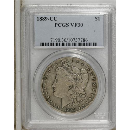 <B>1889-CC S$1 VF30 PCGS.</B></I> A moderately worn dove-gray representative of this key Carson City issue, one of only 350,000 pieces coined. Scattered handling marks and areas of deeper patina are present on each side.<BR><BR><b>Shipping:</b> Coins & Currency (<a target="_blank" href="http://www.heritageauctions.com/common/shipping.php">view shipping information</a>)