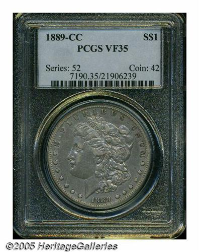 <B>1889-CC<S$1> VF35 PCGS.</B></I> The definition on this highly collectible key is temptingly close to XF quality, but a slightly subdued appearance over steel-blue and peach surfaces perhaps caused it to come up short. Where else but a Heritage Signature Sale can the collector choose from multiple offerings of mid to high grade 1889-CC Dollars?