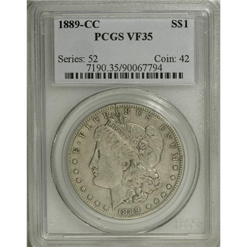 <B>1889-CC S$1 VF35 PCGS.</B></I> The surfaces are a moderate silver-gray, with some faded mint luster still clinging. There are few singular distractions, just the moderate wear expected of the grade. A problem-free Choice VF example of this key-date coin that should fit well into a VF-XF collection.<BR><BR><b>Shipping:</b> Coins & Currency (<a target="_blank" href="http://www.heritageauctions.com/common/shipping.php">view shipping information</a>)
