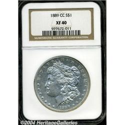 <B>1889-CC<S$1> XF40 NGC.</B></I> Light silvery-gray surfaces with minor flaws as expected for the grade. This is a pleasing example that would add nicely to any high-grade circulated Morgan dollar collection.<BR><I>From The Barry Donnell Collection, Part Two.</B></I> <BR><BR><B>Important notice:</B> Heritage usually auctions material at the rate of 200-250 lots per hour. On some occasions eBay Live bid software or the Internet may not be able to keep up with the pace of the auction. We recommend placing a realistic absentee bid now as insurance to avoid disappointment. Occasionally the auctioneer may eliminate or reject an eBay Live bid, and the auctioneer may also reopen a lot after the close of the eBay live bidding (usually because we missed an audience bid), and may reject your bid even if it shows you as the winning bidder. By bidding via eBay Live, you agree that Heritage may award the lot to another bidder at its sole discretion under the circumstances described above or any other reasonable circumstances. Since eBay bids are not shown to us until we open the lot on the floor, we treat those bids just like floor bids. In most cases the floor responds before the eBay bid is presented to us, due to Internet lag time, so for consistency we have made it a policy that floor bids are always considered first over tie eBay live bids. Also please note that all Heritage lots purchased through eBay Live carry a 20% Buyer's Premium. Please make sure you read the Terms and Conditions before you bid. </span></font></tr></table></td></tr></table>