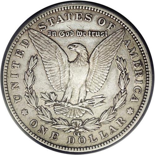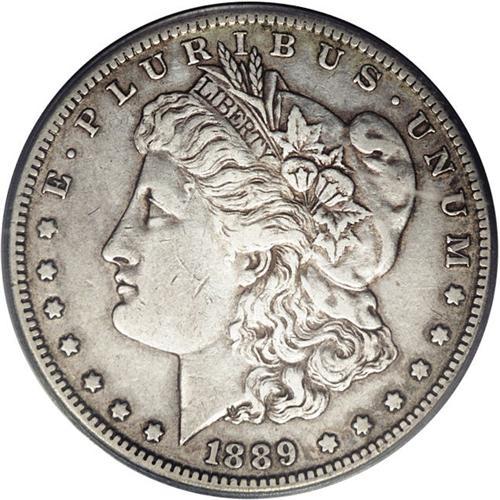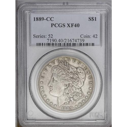 <B>1889-CC<img border='0' src='http://www.heritagecoins.com/images/star.gif' width=10 height=10>$1> XF40 PCGS.</B></I> One of the most attractive XF examples of this key date that we have encountered. Both sides are surprisingly free from large or distracting abrasions, except for one moderate mark on the upper reverse field, directly above OD in GOD. The surfaces are a pewter-gray color and show a slight degree of golden luster near the peripheries. By far the scarcest Carson City Morgan, particularly in grades above XF.