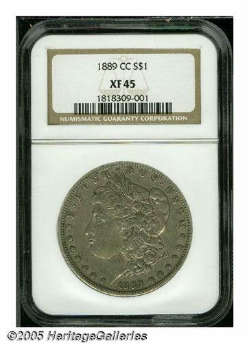 <B>1889-CC<S$1> XF45 NGC.</B></I> This Choice XF example has light silver-gray toning with just a touch of charcoal here and there in the protected areas. Minimally worn with very few abrasions. Still well defined at this grade level and relatively affordable when compared to AU or Uncirculated pieces.