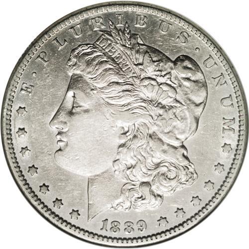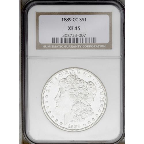 <B>1889-CC<img border='0' src='http://www.heritagecoins.com/images/star.gif' width=10 height=10>$1> XF45 NGC.</B></I> This key Morgan dollar is impressive for the assigned grade, since luster brightens the legends, stars, wings, and hair. The fields and cheek display light stone-gray toning. Handling marks are surprisingly few for the grade, and the centers, cap, and eyebrow have limited wear.