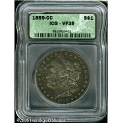 <B>1889-CC<img border='0' src='http://www.heritagecoins.com/images/star.gif' width=10 height=10>$1 VF25 ICG.</B></I> A key to the series, this dollar is darkly toned throughout with surfaces that are evenly worn and lightly abraded. A highly sought-after coin in any grade. Lot:10292