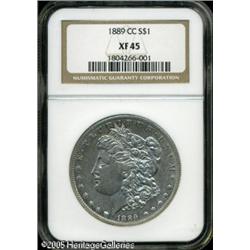 <B>1889-CC<img border='0' src='http://www.heritagecoins.com/images/star.gif' width=10 height=10>$1 XF45 NGC.</B></I> Subtle hints of peripheral gold toning with the majority of the coin silvery-gray with traces of luster in the protected areas. Minor handling nicks from brief circulation and rather nice for the grade overall. Always in strong demand as this is one of the key dates to the Morgan dollar series. Lot:10299