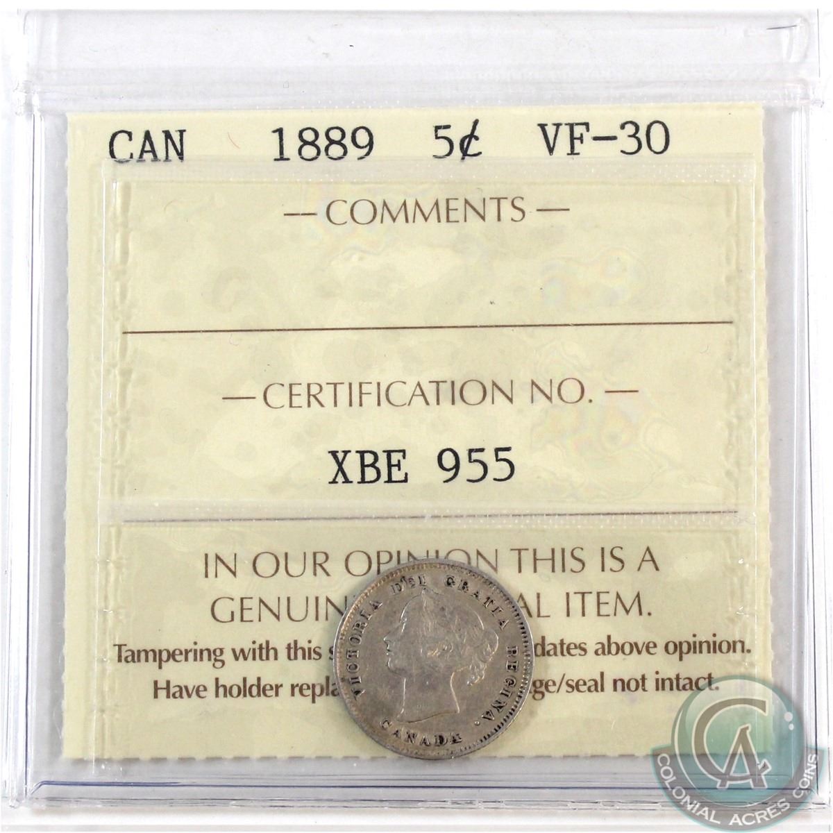 1889 Canada 5-cent ICCS Certified VF-30