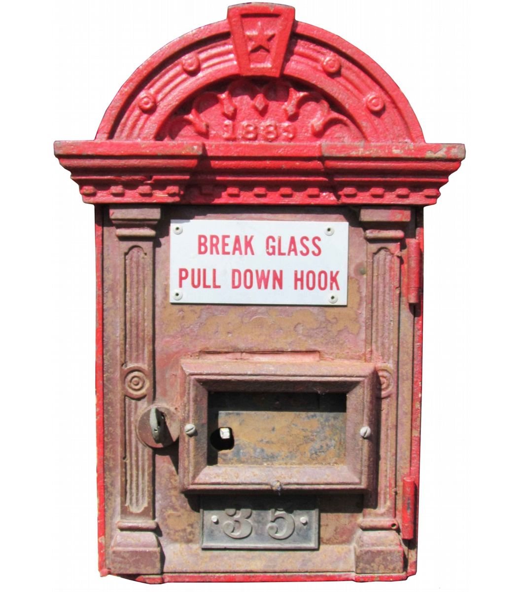 1889 Cast Iron Fire Alarm Box. Replacement front door with contents, exterior door has key. 18 1/4 inches tall.