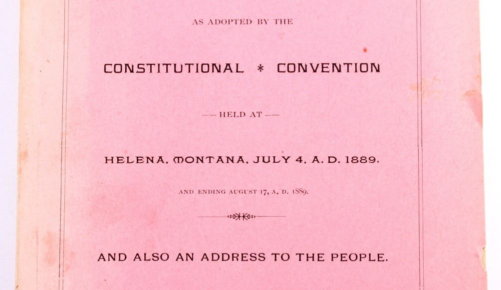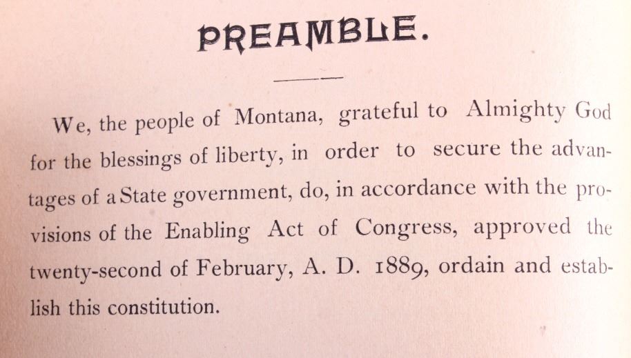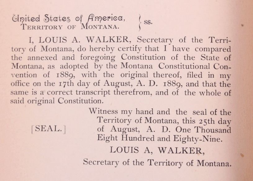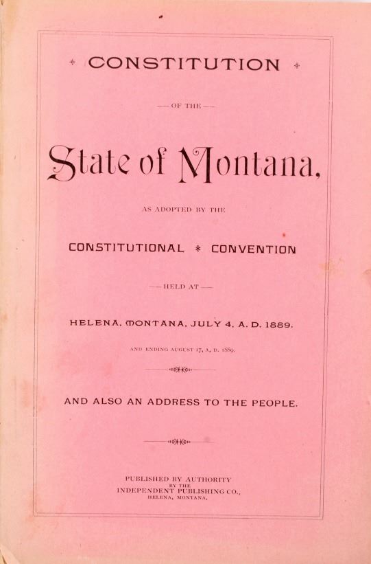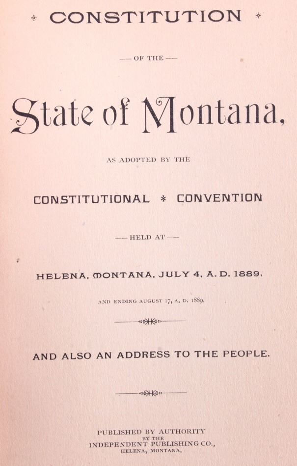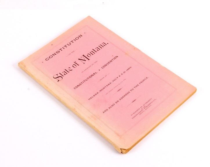 This is an 1889 publication of the "Constitution of the State of Montana". These very early articles adopted by the Constitutional Convention are the framework by which Montana has been built upon. This is an important historical archive. The piece was published by Independent Publishing Co. of Helena, Montana. The book is complete and shows good condition. It measures 5.25" x 8".