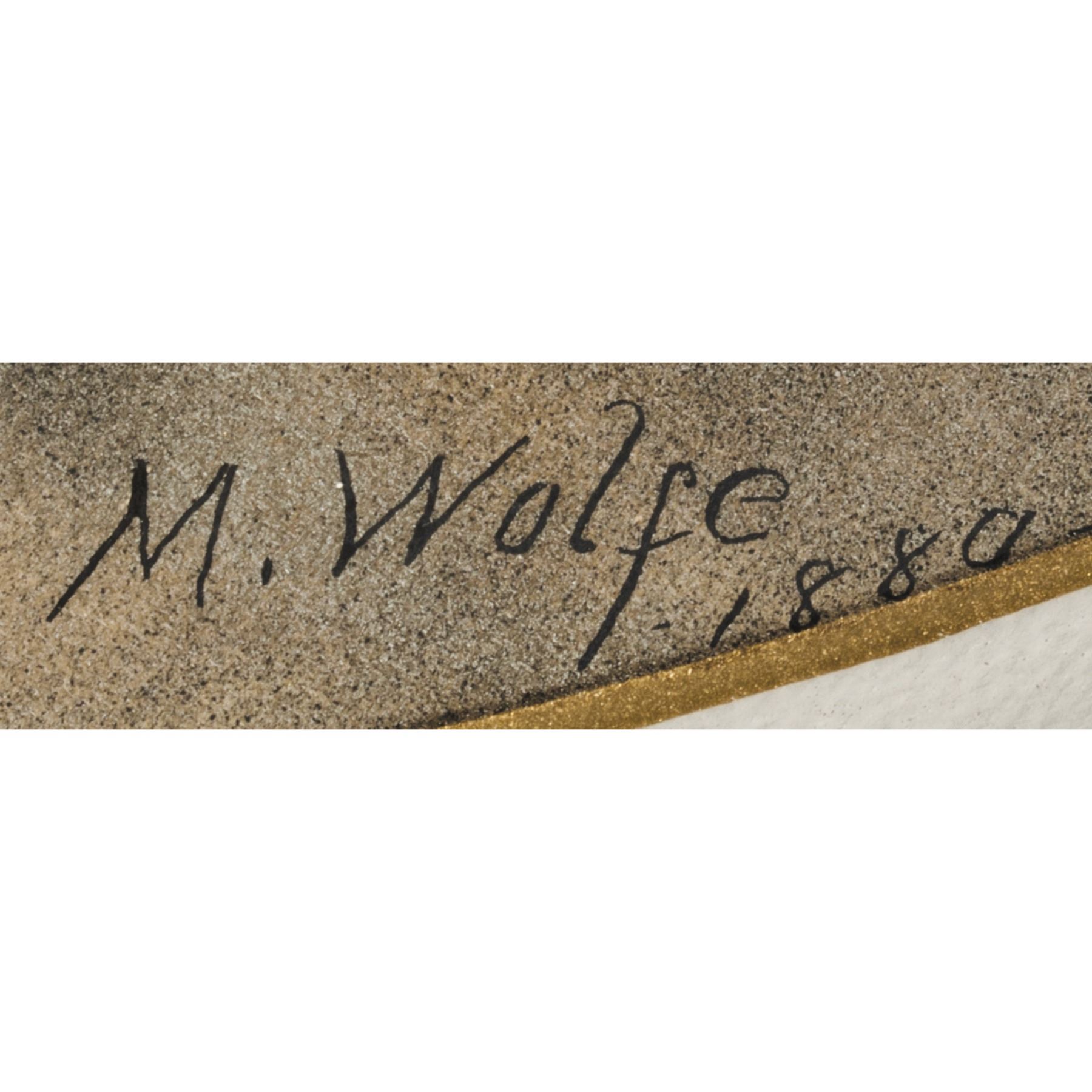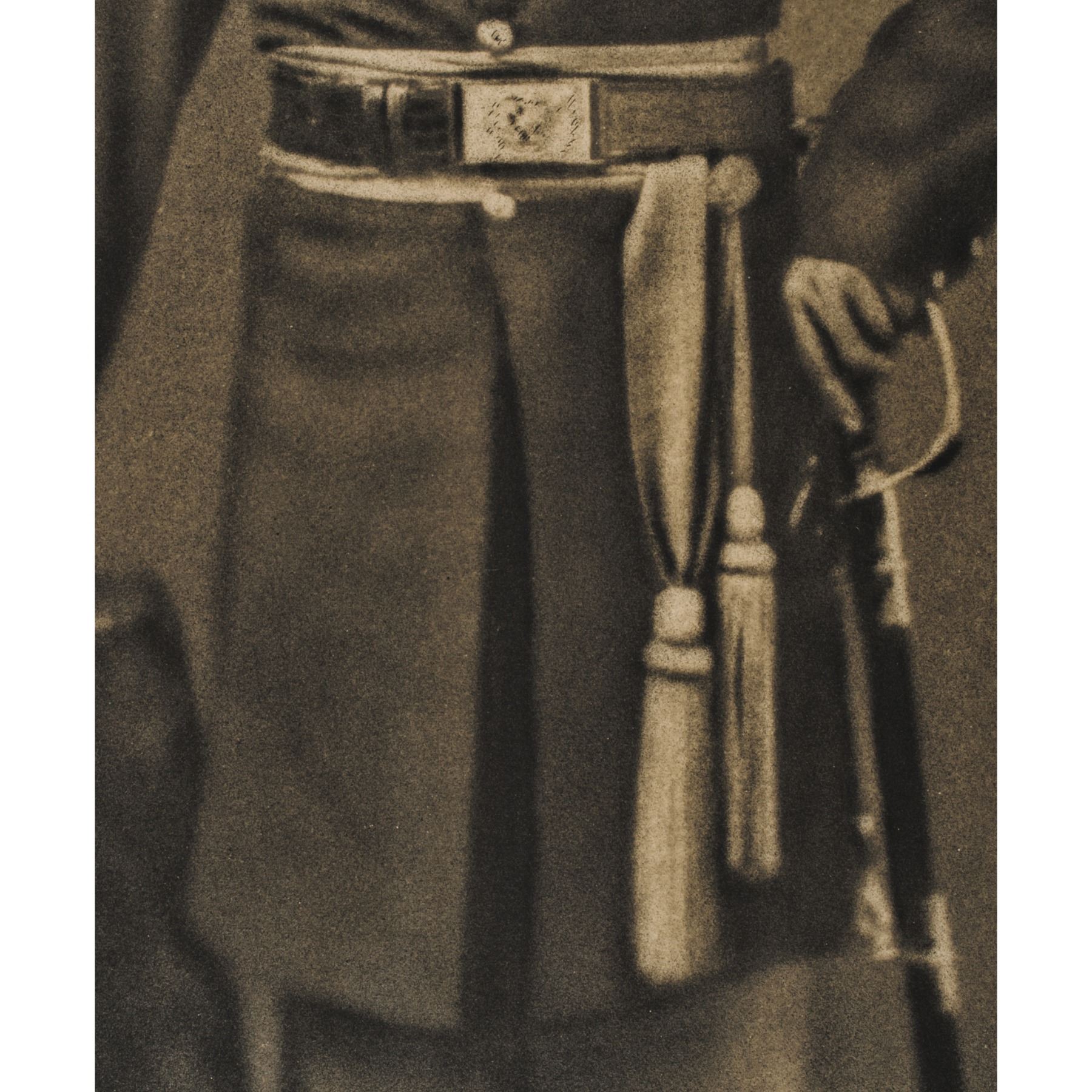 This original albumen Print measures 20” x 16” (by sight), professionally matted and framed to an overall size of 26.75” x 22.75”. The image is a full length Portrait of a Union General who is standing with his Sword at rest in one hand and is leaning against a covered table with his other. This image is Signed at lower right, “M. Wolfe - 1889”. Excellent professional presentation framing for this historic Portrait likely cost several hundred dollars of itself. It is beautifully displayed, being inset about .75” with a white fabric surround which itself is matted and within a decorative gold painted wooden frame. This impressive quality Mammoth Size Portrait of a Union General is ready for hanging on display.