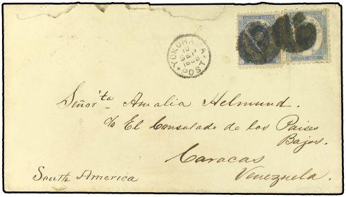 1889 Destination mail envelope to CARACAS (Venezuela) bearing Koban, 5 sen blue (perf. 8 1/2) (SG 115); 5 sen blue (perf. 13) (SG 115) tied by cork cancels with adjacent YOKOHAMA POST thimble cds (pre-paying the U.P.U. rate) routed via San Francisco with transit on reverse. Very rare mixed franking and very rare destination.