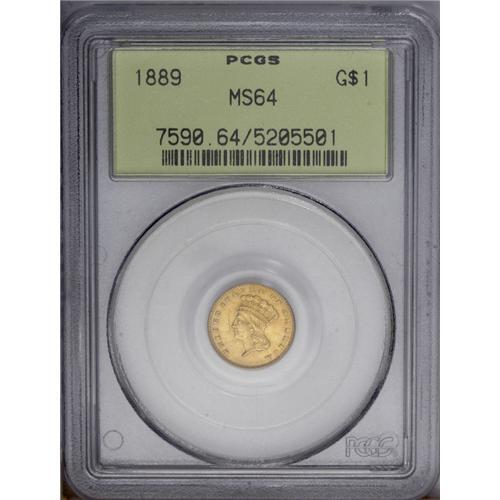 <B>1889<G$1> MS64 PCGS.</B></I> A magnificently struck older holder near-Gem that possesses rich peach and steel-blue toning. The lower wreath is die doubled south, as usual for the date. <BR><BR><B>Important notice:</B> Heritage usually auctions material at the rate of 200-250 lots per hour. On some occasions eBay Live bid software or the Internet may not be able to keep up with the pace of the auction. We recommend placing a realistic absentee bid now as insurance to avoid disappointment. Occasionally the auctioneer may eliminate or reject an eBay Live bid, and the auctioneer may also reopen a lot after the close of the eBay live bidding (usually because we missed an audience bid), and may reject your bid even if it shows you as the winning bidder. By bidding via eBay Live, you agree that Heritage may award the lot to another bidder at its sole discretion under the circumstances described above or any other reasonable circumstances. Since eBay bids are not shown to us until we open the lot on the floor, we treat those bids just like floor bids. In most cases the floor responds before the eBay bid is presented to us, due to Internet lag time, so for consistency we have made it a policy that floor bids are always considered first over tie eBay live bids. Also please note that all Heritage lots purchased through eBay Live carry a 20% Buyer's Premium. Please make sure you read the Terms and Conditions before you bid. This lot is being auctioned in conjunction with a live floor auction by Heritage Galleries & Auctioneers. All final auction and invoice information will be supplied by Heritage Galleries & Auctioneers, and all other information should be considered preliminary. Lot:2325 <BR><BR><B>Winning Notification and Billing:</B> After the FINAL session in this auction is complete, Heritage will send e-mail and snail mail invoices. This process normally takes several days. All final auction and invoice information will be supplied by Heritage Galleries & Auctioneers, and all other information should be considered preliminary. <BR><BR>This auction will be conducted on a live auction floor and over the Internet through eBay Live. If you choose to place an absentee bid, please take a moment to <font color='#0000ff'><u><a href='http://pages.ebay.com/liveauctions/help/before/laabsentee.html'>learn how eBay Live absentee bidding works</a></u></font><font color='#000000'>