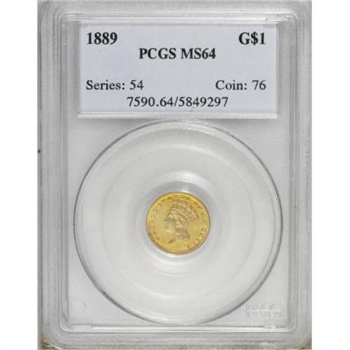 <B>1889 G$1 MS64 PCGS.</B></I> Unusually attractive peach and green-gold endow this semi-prooflike Choice gold dollar. Boldly struck save for the C in AMERICA, and undisturbed except for a small mint-made lintmark at 6 o'clock on the reverse.<BR><BR><B>Coin Engraver:</B> James B. Longacre<BR><BR><b>Shipping:</b> Coins & Currency (<a target="_blank" href="http://www.heritageauctions.com/common/shipping.php">view shipping information</a>)