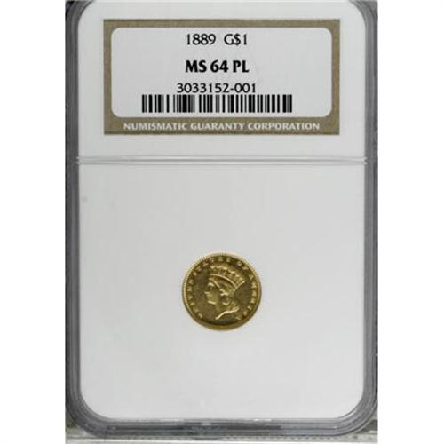 <B>1889 G$1 MS64 Prooflike NGC.</B></I> A flashy and meticulously struck near-Gem with beautifully smooth fields and devices. The ER in LIBERTY is weak, as made from a lapped obverse die. Census: 5 in 64 Prooflike, 11 finer (8/07).<BR><BR><B>Coin Engraver:</B> James B. Longacre<BR><BR><b>Shipping:</b> Coins & Currency (<a target="_blank" href="http://www.heritageauctions.com/common/shipping.php">view shipping information</a>)