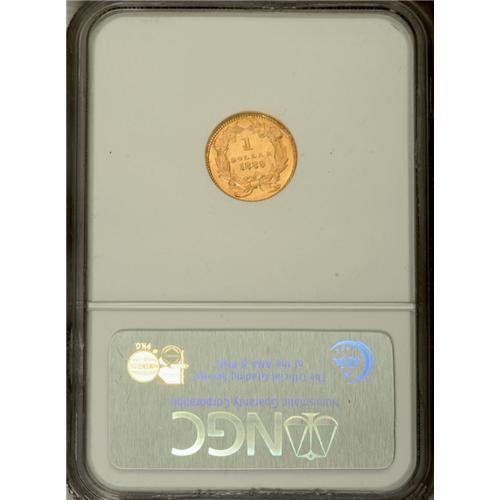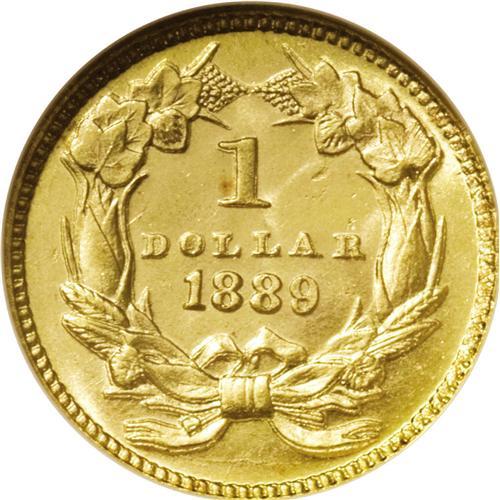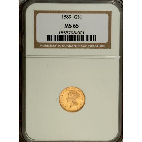 <B>1889 G$1 MS65 NGC.</B></I> This exactingly struck Gem exhibits dazzling luster throughout the fields, and neither side shows any indication of post-strike contact. A beautiful type coin from the final date of the series. As always seen on the business strikes, the wreath ribbon is prominently die doubled south.<BR><BR><b>Shipping:</b> Coin/Currency (<a target="_blank" href="http://www.heritageauctions.com/common/shipping.php">view shipping information</a>)